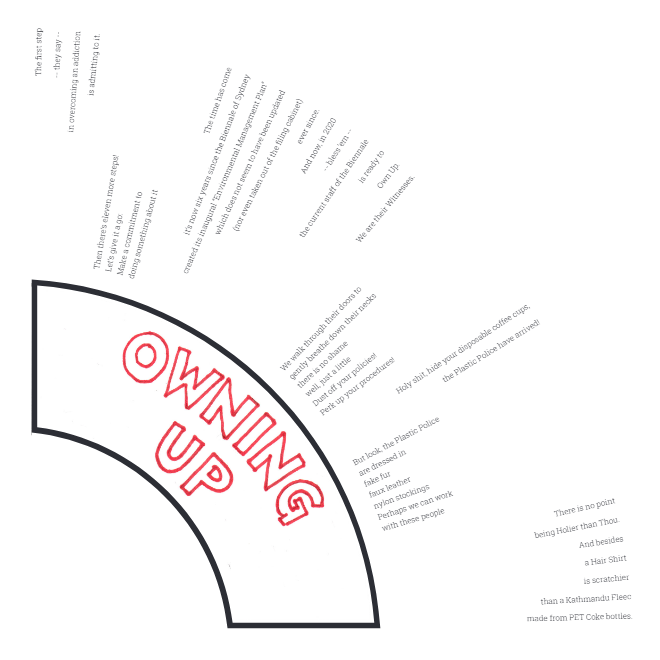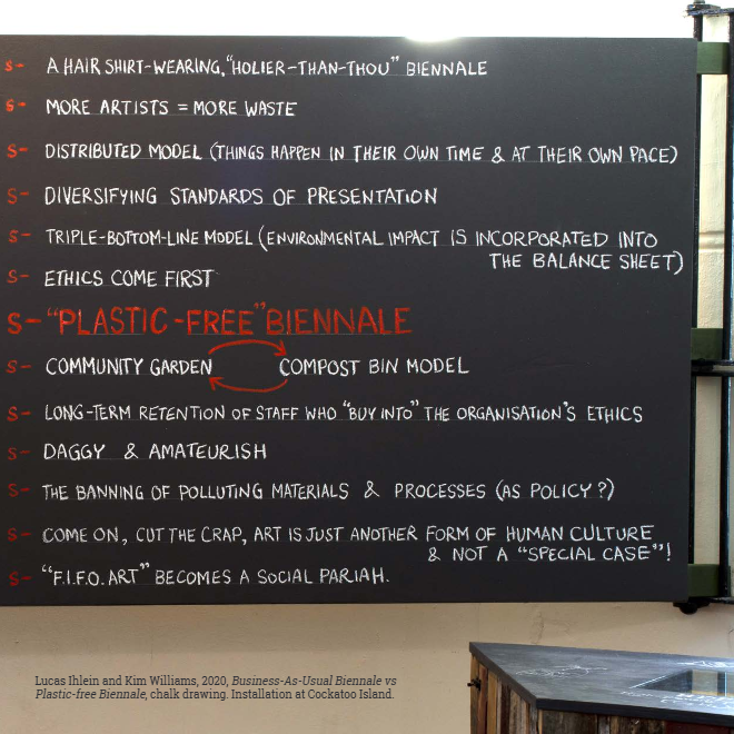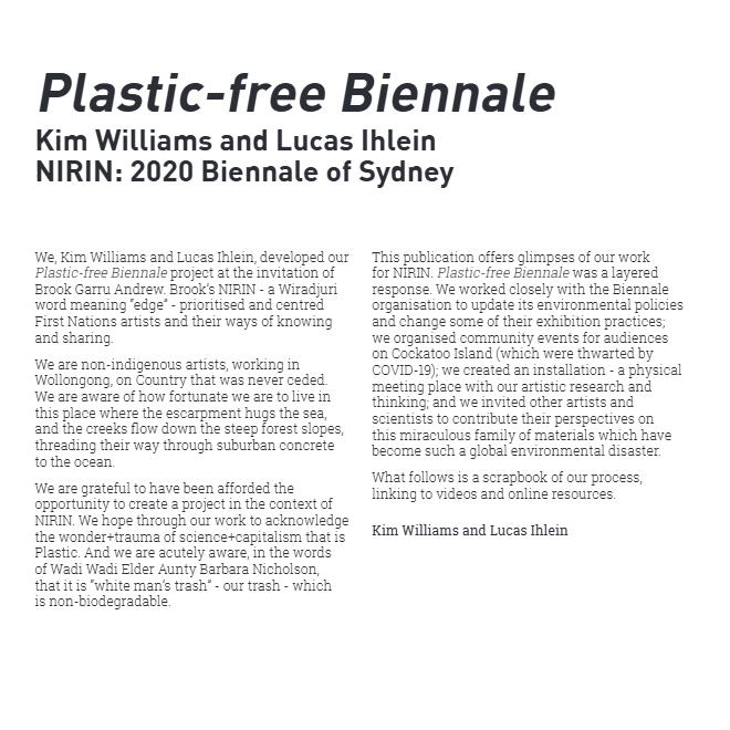 Plastic-free Biennale (Kim Williams and Lucas Ihlein) was commissioned by artistic director Brook Garru Andrew for NIRIN, the 2020 Biennale of Sydney. We were asked to facilitate the Biennale’s desire to go plastic-free (a metaphor for putting their environmental house in order).