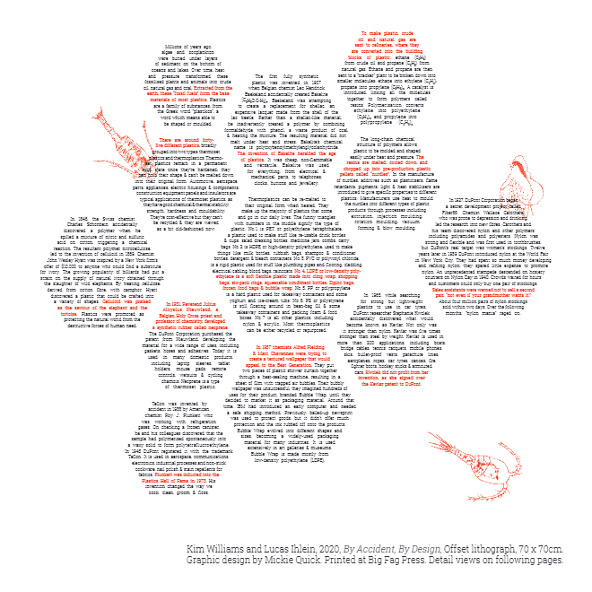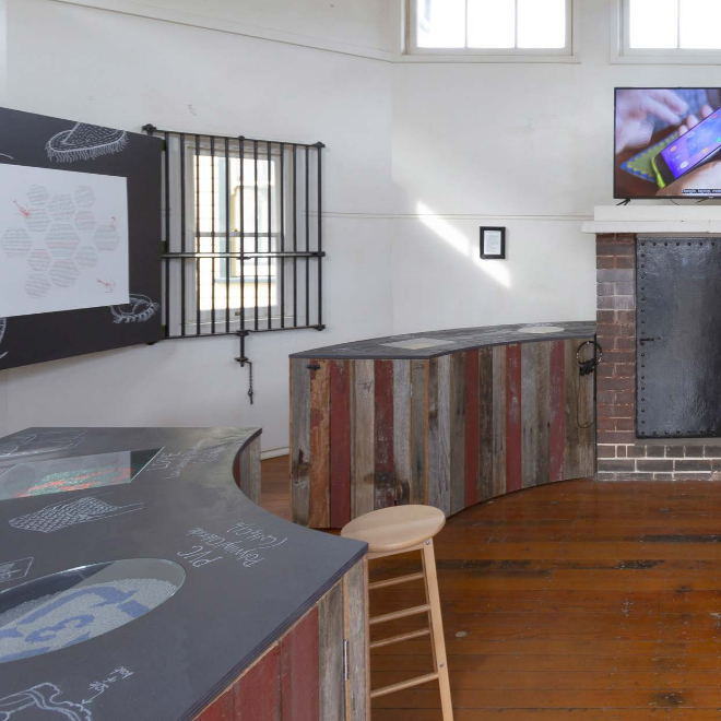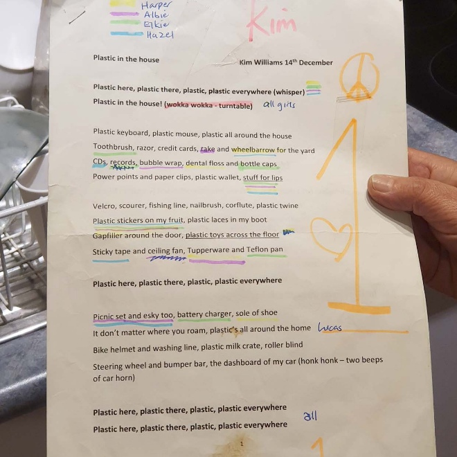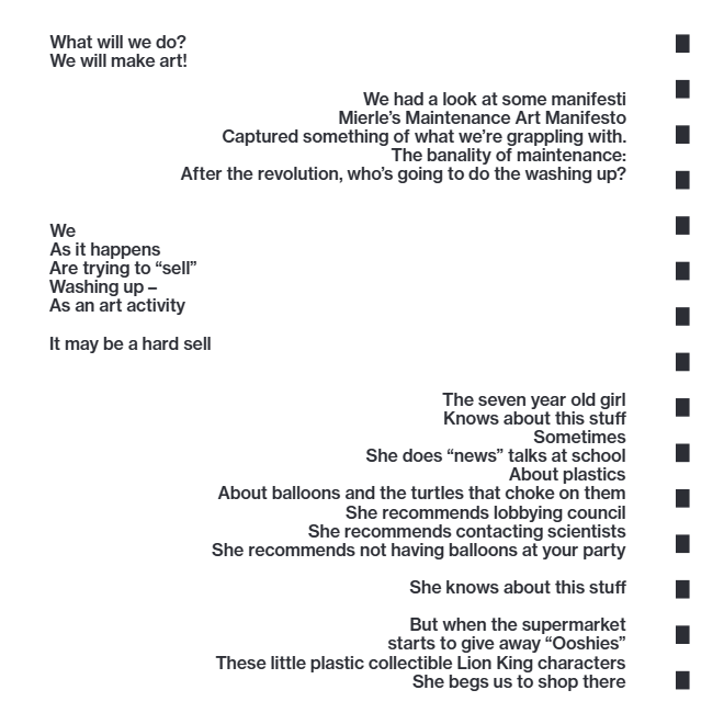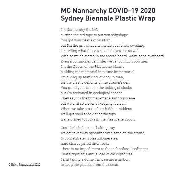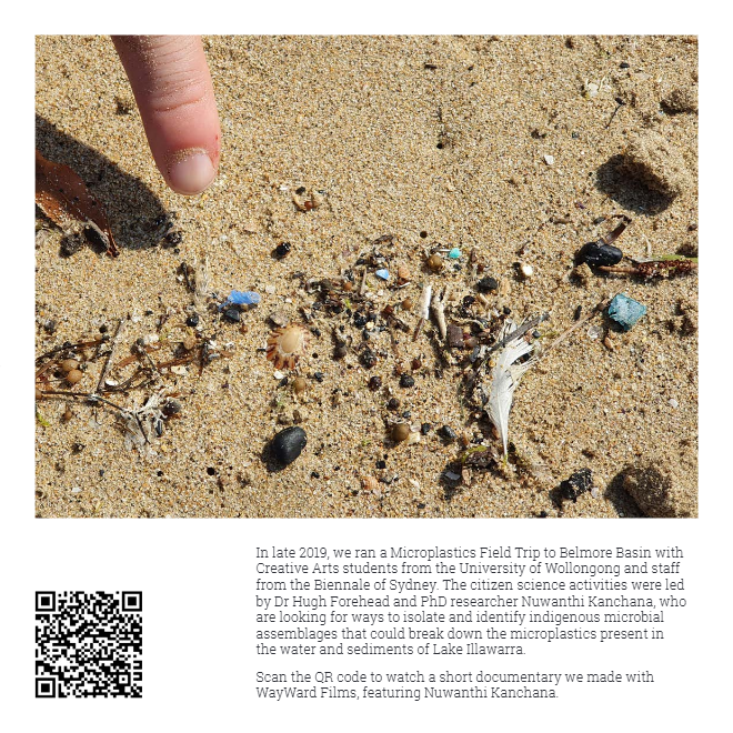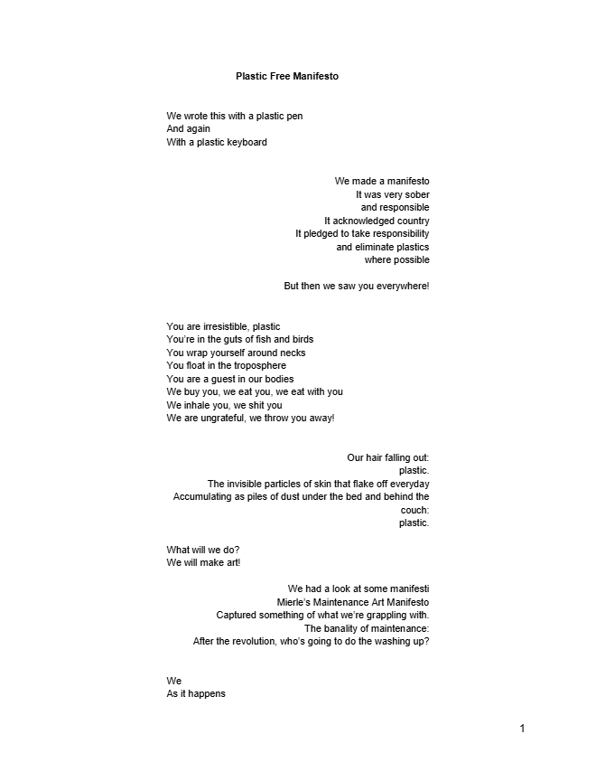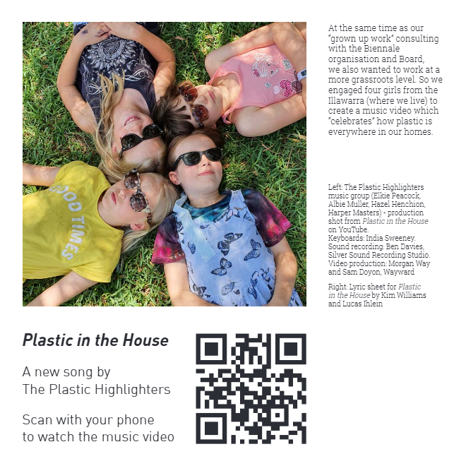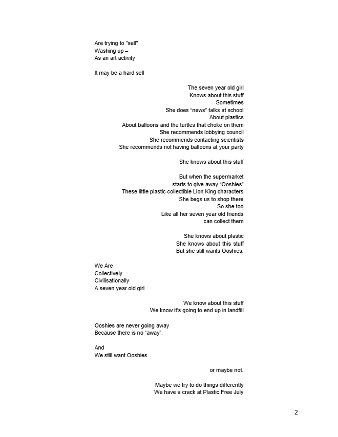 This project involved a number of different angles: organisational consultancy, a physical installation, research, community engagement, mentoring emerging artists, writing manifestos, working with Wadi Wadi elder Aunty Barbara Nicholson, producing prints, writing a song, working with children to make a music video about household plastics, working with scientists to make a video about microplastics in waterways.